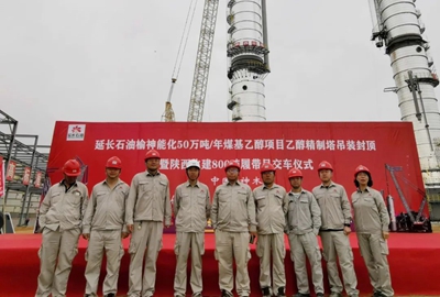 6月8日,由公司EPC總承包的榆神能化50萬噸/年煤基乙醇項目乙醇精制塔吊裝封頂暨800噸履帶吊交車儀式在乙醇裝置現場隆重舉行。公司總經理助理田平漢出席儀式并講話,榆神能化公司執行董事、支部書記李軍林,總經理、支部副書記郭尊禮,以及各參建單位相關負責人等參加了儀式。