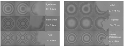 圖2. 不同溶液中疏水表面退潤(rùn)濕所需時(shí)間(視場(chǎng)大小:384×384 μm)