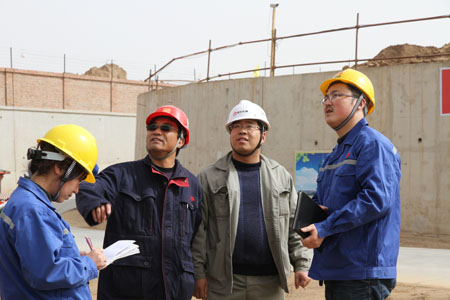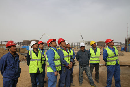 在煤-油共煉試驗(yàn)示范項(xiàng)目工地,總包單位和業(yè)主安全管理人員進(jìn)行安全檢查。