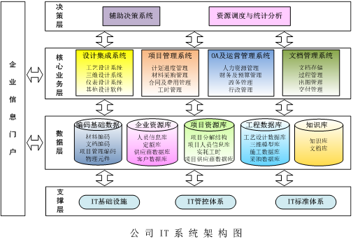 公司建立起以設(shè)計集成系統(tǒng)、項目管理系統(tǒng)、OA及運營管理系統(tǒng)、全面預算系統(tǒng)和文檔管理系統(tǒng)為主體的核心業(yè)務層系統(tǒng),對工程設(shè)計、工程項目管理、公司運營管理的日常工作起到支撐作用。